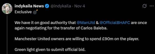 布朗指出,在上个月曼联4-2战胜布莱顿的比赛中,巴莱巴未能给潜在的新东家留下深刻印象,反而引起了人们的担忧。曼联赛季中途引进一名状态不佳的球员,也没有意义。而且,吉姆·拉特克里夫爵士不会在冬窗花费9000万英镑巨资。