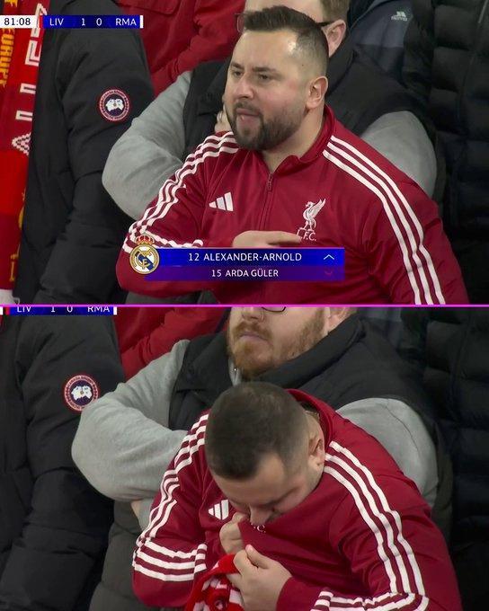 镜头中一位利物浦球迷甚至手指衣服上的队徽怒斥阿诺德,似乎在说:“去皇马当替补,你后悔了吗?”,显然在他们看来,这位昔日青训骄子如今就是球队的“叛徒”。