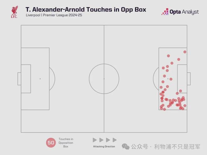 他相当一部分触球发生在危险区域,但显然这与他担任边翼卫的身份有关。在本赛季德甲联赛中,勒沃库森仅有维尔茨(162次)和希克(118次)在对方禁区内的触球次数多于弗林蓬(117次),而他每90分钟在对方禁区内的4.5次触球次数远高于阿诺德的1.9次。然而,尽管布拉德利踢的是右后卫而非后翼卫,但他场均触球次数为5.4次。斯洛特可能希望他的右后卫比阿诺德更频繁地突入禁区。